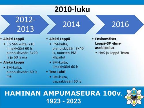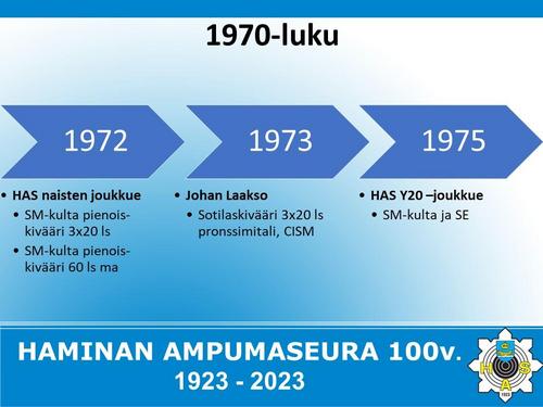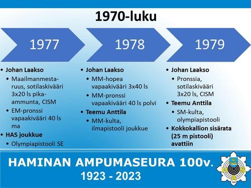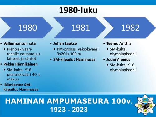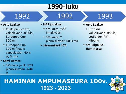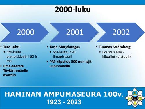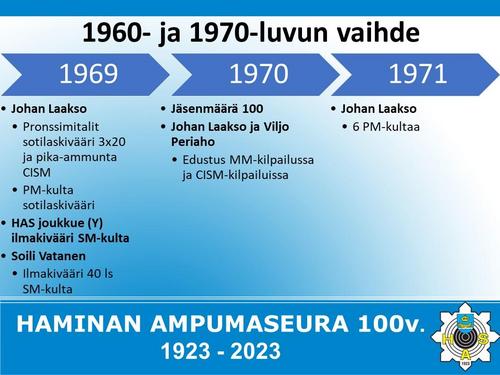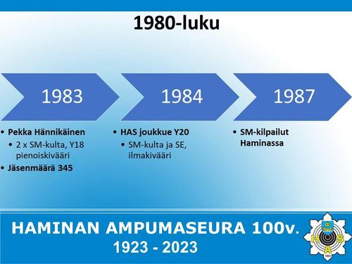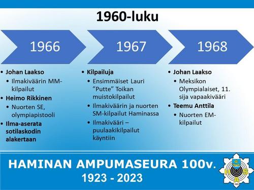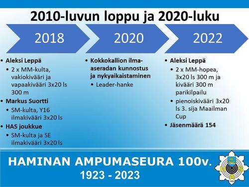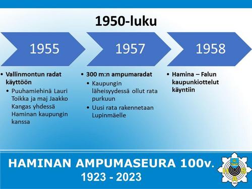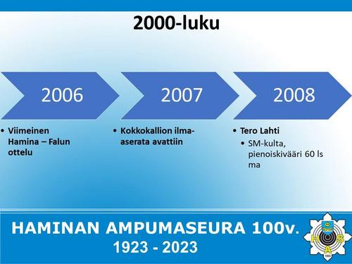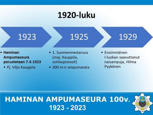 Alla on esitetty Haminan Ampumaseuran 100 vuotista historiaa aikajanalla. Aikajana on esitetty kuvina sekä vielä tarkemmin alla olevassa Word-tiedostossa.